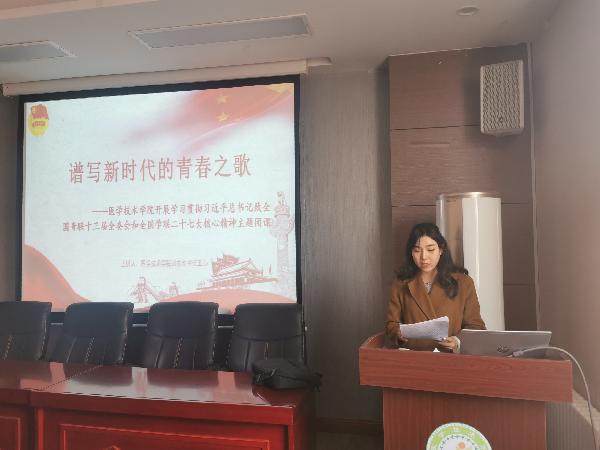 团课上,王心老师带领团员从“坚定理想信念”、“培育高尚品格”、“练就过硬本领”、“勇于创新创造”、“矢志艰苦奋斗”五个方面,重温习近平总书记对青年们的要求与期望。同时,结合身边故事,她指出,无论是在科技攻关最前沿,还是在志愿服务第一线,到处活跃着青年人拼搏向上的身影。尤其是面对突如其来的新冠肺炎疫情,广大青年踊跃投身抗疫斗争,不畏艰险、冲锋在前,用实际行动彰显了新时代中国青年的形象。随后,王心老师号召所有的学生干部也要充分发扬奉献精神,提高组织能力,全身心投入每一项工作,更好地发挥学生组织的引领和服务作用,丰富团员青年们的校园生活。最后,王心老师对本学期已开展的工作进行总结,并指出存在的问题,对此提出改进措施和下一步要求。她希望学生干部要继续发扬医技优良传统作风,并拓展出更新颖、更有吸引力的校园活动,提高团员青年的凝聚力。
