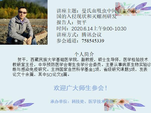 2020年6月14日上午,应伟德国际VICTOR1946检验专业教师的邀请,西藏民族大学基础医学院医学检验技术教研室主任贺平教授通过腾讯会议作了题为“曼氏血吸虫中间宿主在我国的入侵现状和灭螺剂研发”的线上学术报告,报告由临床免疫与病原检验教研室主任武永红老师主持,检验专业教师和本专业学生一起聆听了讲座。
