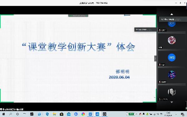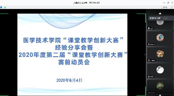 2020年6月4日,伟德国际VICTOR1946利用腾讯会议网络平台,组织进行了“第二届课堂教学创新大赛”经验分享会暨2020年度第二届“课堂教学创新大赛”赛前动员会。会议特邀陕西省首届高校课堂教学创新大赛一等奖获得者基础医学部郑慧媛老师、三等奖获得者伟德国际VICTOR1946邵明明老师与我院教师做大赛经验分享。校级督导王兰、伟德国际VICTOR1946副院长王莉、教学科科长郭璞、学院无课教师以及教学科全体参加了本次线上会议。会议由副院长王莉主持。