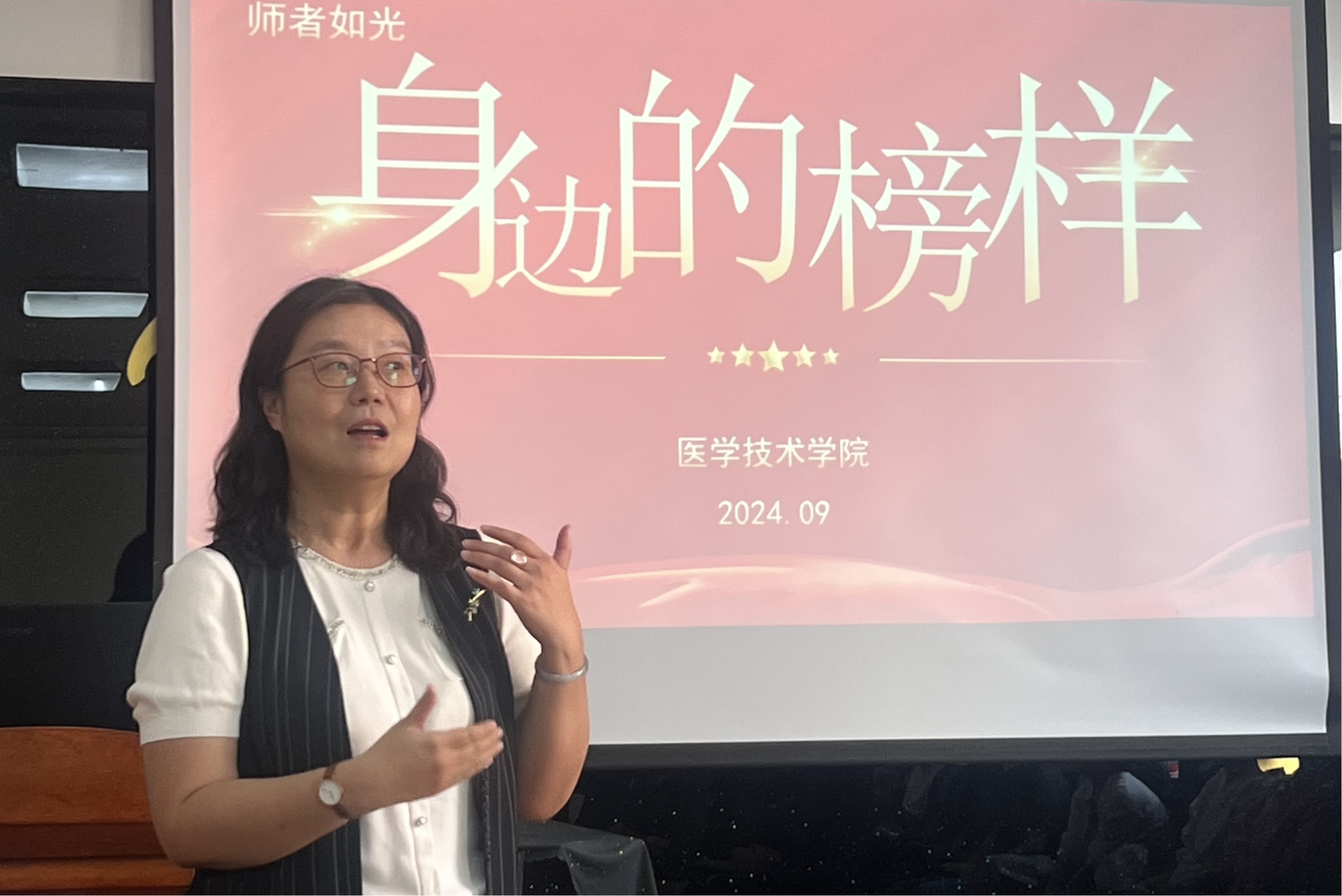 为深入贯彻习近平总书记的重要讲话精神,弘扬教育家精神,贯彻“强教必先强师”理念,9月27日,伟德国际VICTOR1946在学院报告厅举办“师者如光--学习身边的榜样”活动。活动由学院院长孙静主持,学院党总支书记任向明、党总支副书记徐景彩、副院长王莉及全体教师参加活动。