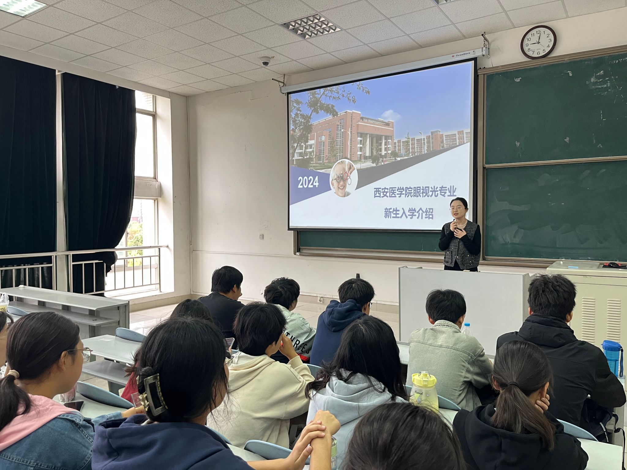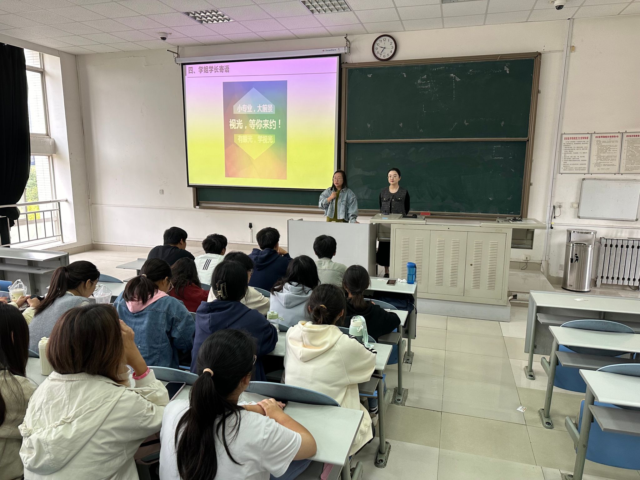 首先,眼视光学专业李怡琛老师为同学们介绍了我国教育部眼视光学专业设置及定位、国内外眼视光学专业的发展现状、我校眼视光专业的发展历程及职业规划和就业前景。之后,眼视光学专业闫瑾老师围绕大学四年的学习、生活总体规划,专业课程设置,课外科研,考研就业等同学们关心的问题,与同学们现场互动,进行了细致的解答,让同学们多个维度对眼视光专业有了更深入的理解。