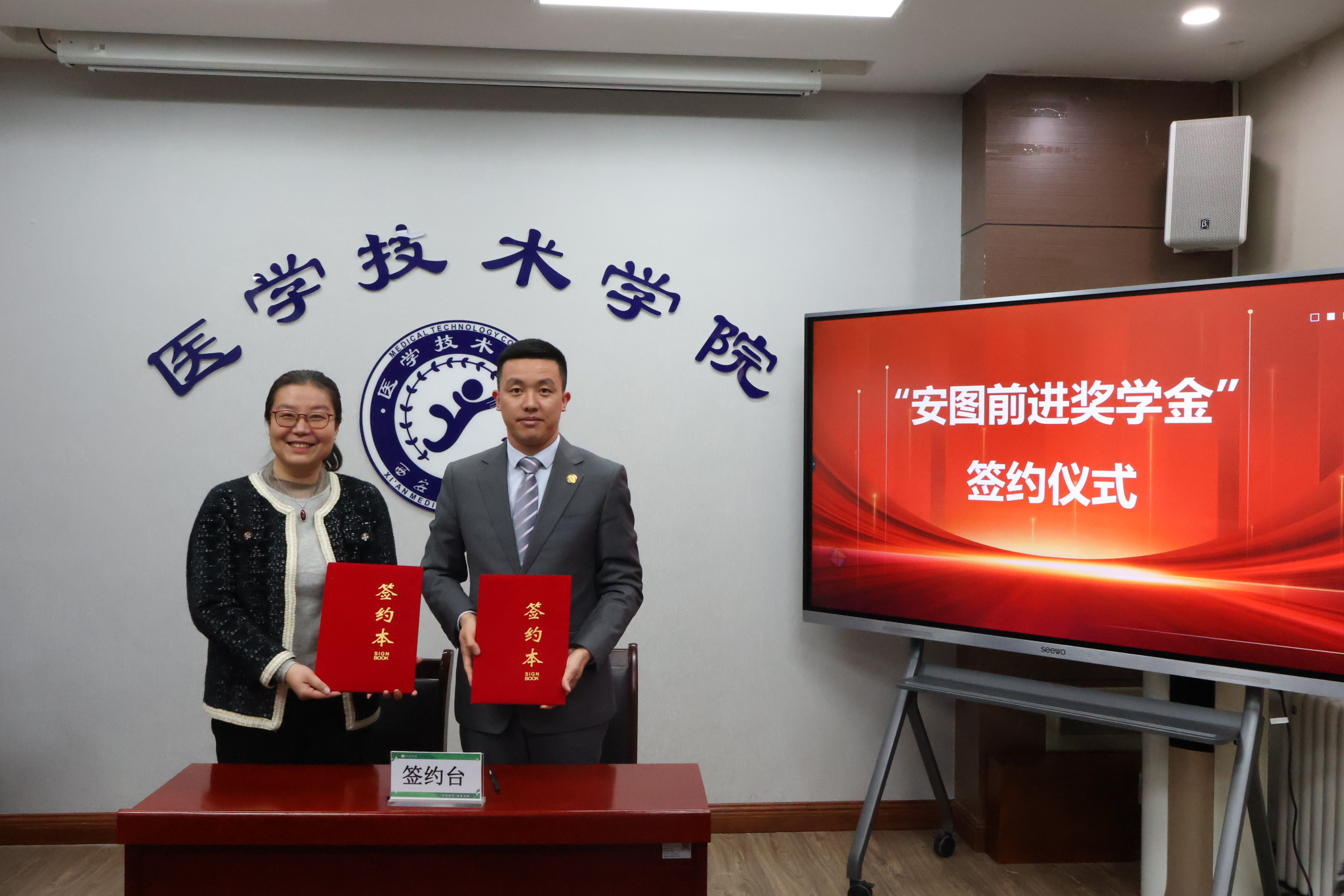 2025年1月2日,安图前进奖学金签约及颁奖仪式在西安医学院伟德国际VICTOR1946报告厅举行。郑州安图生物工程股份有限公司西北大区副总经理周虎及相关负责人出席,伟德国际VICTOR1946党总支书记任向明、院长孙静、检验教研室主任李海燕、学院科级干部、辅导员、教师代表及学生代表参加仪式。仪式由副院长王莉主持。