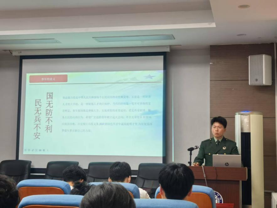 为增强学生国防意识,高质量推动学院征兵工作,5 月 21 日,在学术报告厅举办征兵宣讲会。会议采取线上线下同步进行,征兵专干刘向锋主持会议。
