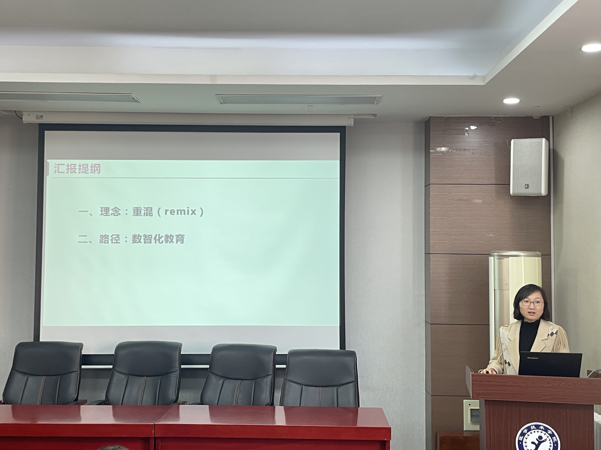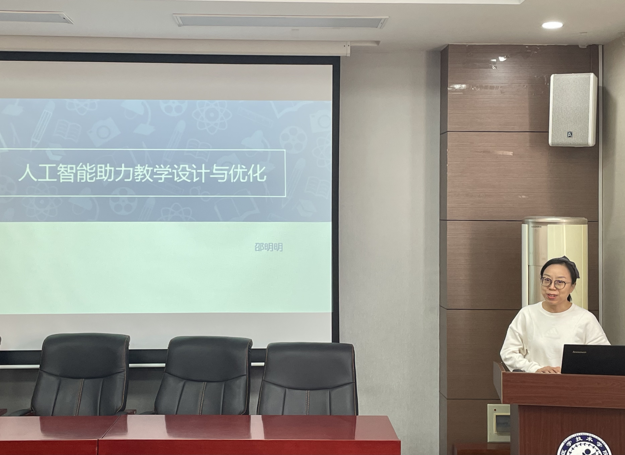 本次赴北大培训学院共选派2名骨干教师参与,分享会上,参训教师围绕“人工智能助力教学设计与优化”和“数智化教育体系构建”两大核心主题,结合培训所学与教学实际,系统汇报学习成果并提出实践应用思路。