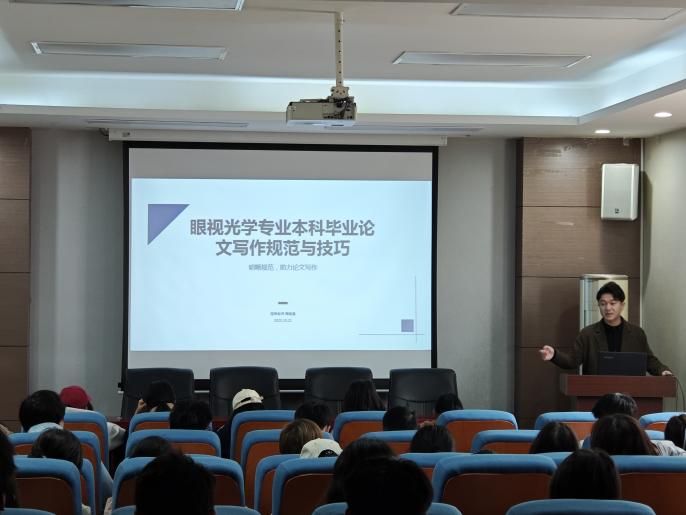 10月21日下午16时,眼视光教研室周维通老师于学院报告厅为眼视光学专业本科生开展了一场眼视光学专业本科毕业论文写作规范与技巧的专题讲座,眼视光专业在校学生80余人参加了活动。本次活动旨在帮助学生系统掌握毕业论文的撰写流程与规范要求,提升论文质量。