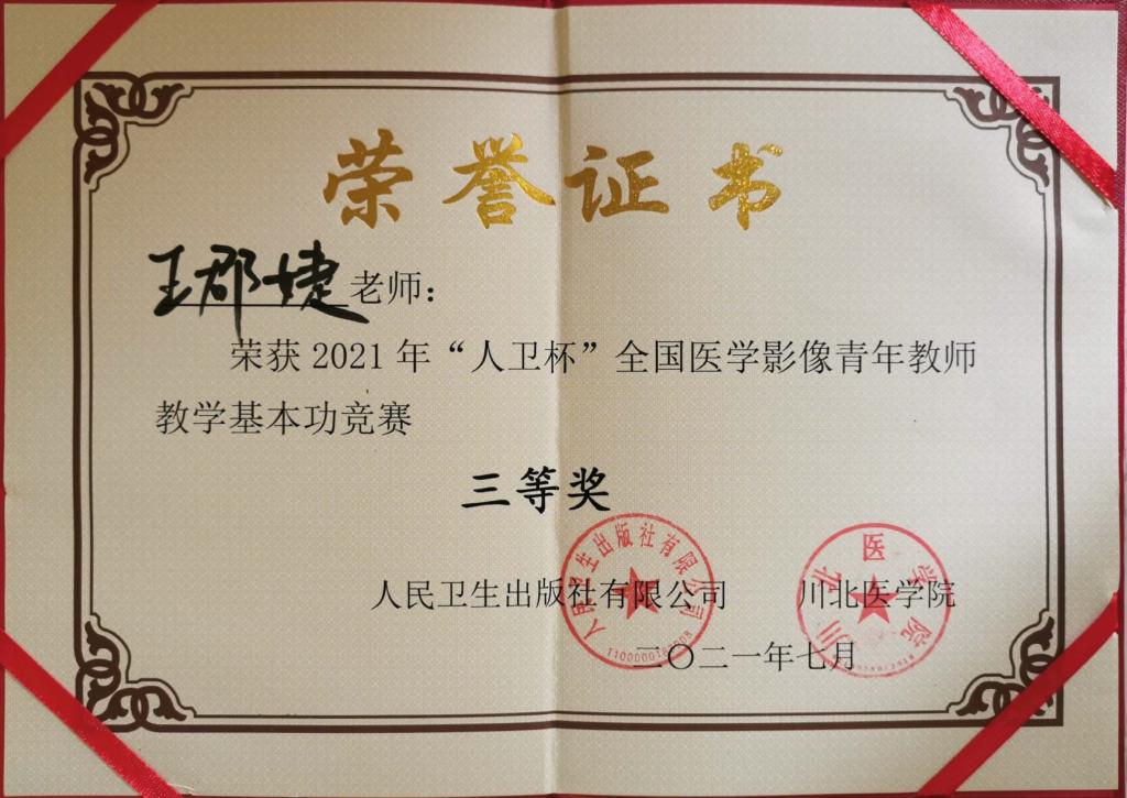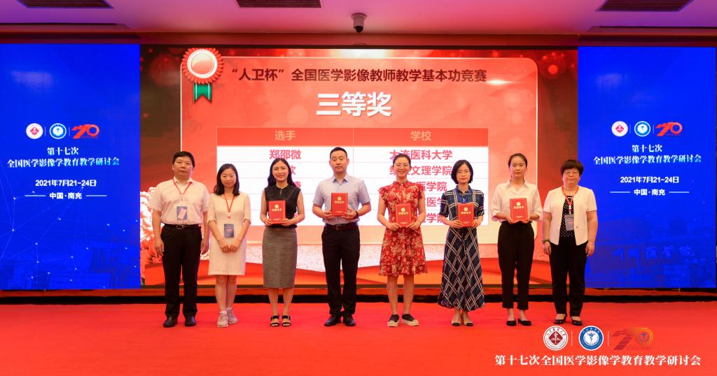2021年7月22日,第十七次全国医学影像学教育教学研讨会暨“人卫杯”全国医学影像教师教学基本功竞赛在四川省南充市举行。本次大赛由人民卫生出版社主办,天津医科大学、川北医学院联合承办。伟德国际VICTOR1946医学影像技术专业参赛教师王郡婕现场决赛发挥稳定,获得2021年“人卫杯”全国医学影像青年教师教学基本功竞赛三等奖。