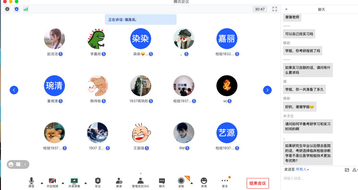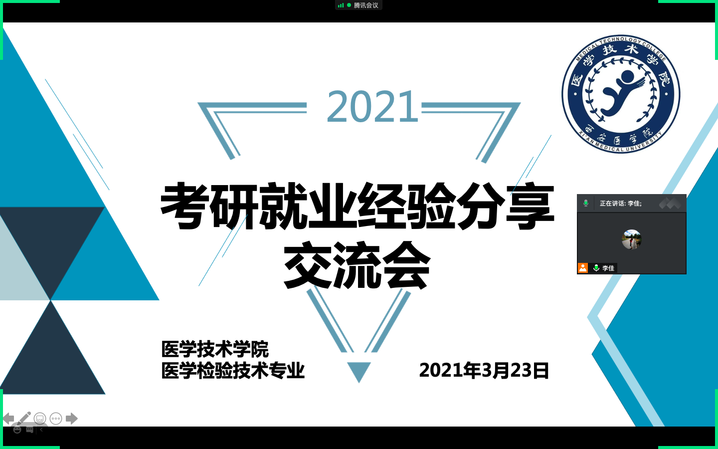 为进一步推动学院学生就业工作,增强我院学生考研、就业的针对性,发挥朋辈榜样作用,3月23日晚,伟德国际VICTOR1946通过腾讯会议为医学检验技术专业的学子搭建了一个互联互通的交流平台,本次交流会邀请了优秀毕业生蒲晟岚分享成功考验和求职经验。会议由辅导员李佳主持。