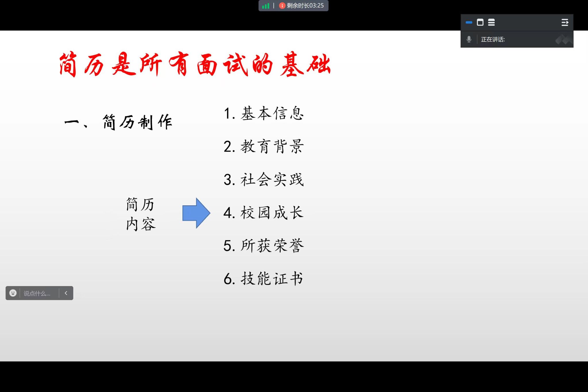 首先,李卓遥老师讲解了简历制作的基本原则,简历就是简单的履历,无复杂,真话不全说、假话绝不说、锦上添花说。随后逐一讲解简历六项基本内容:基本信息、教育背景、社会实践、校园成长、所获荣誉、技能证书。基本信息和教育背景中,无效信息不写,必须出现的基本信息包括:姓名、年龄、联系方式、电子邮箱、生源地。