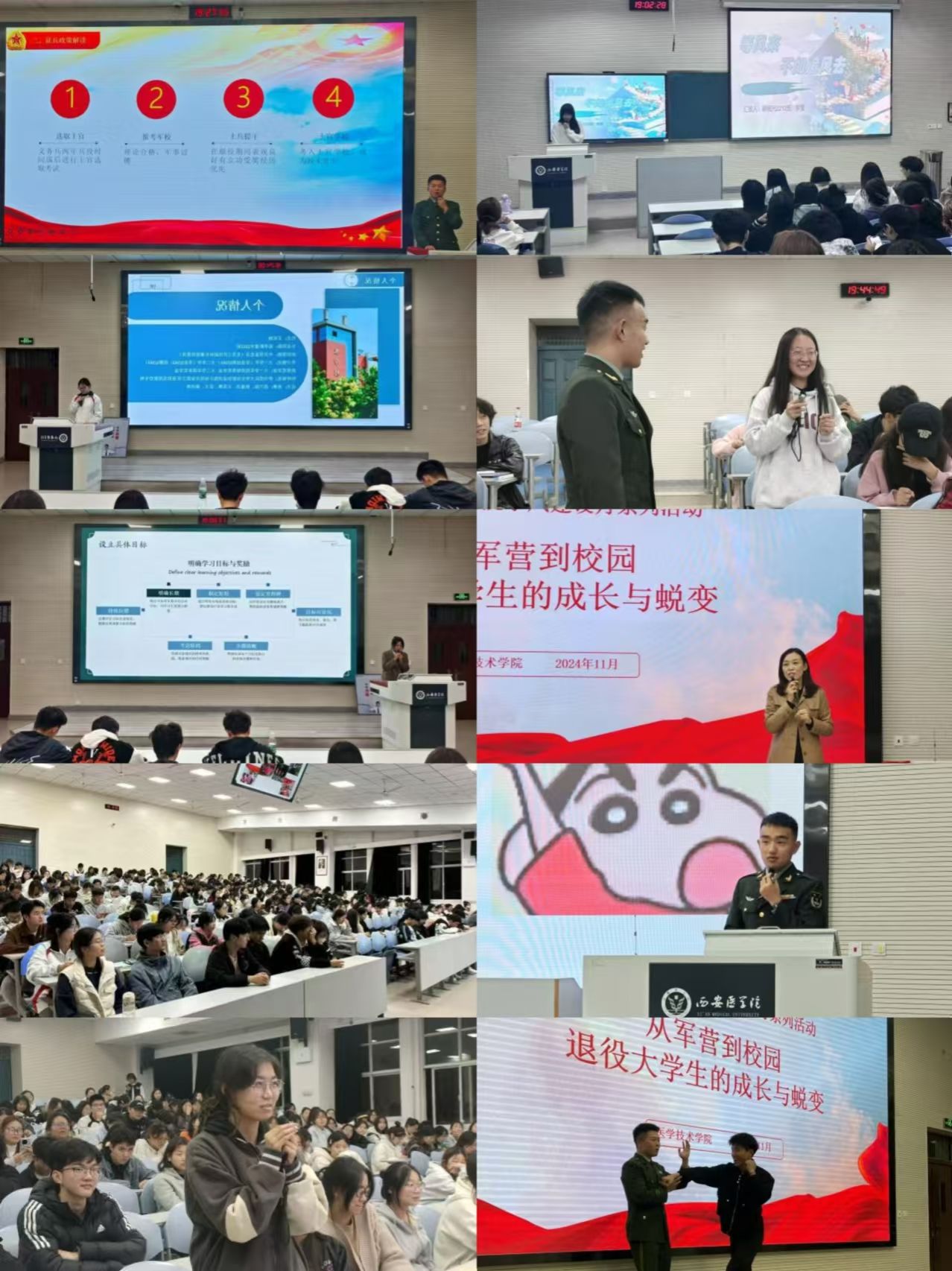 检验2348班刘俊和医学影像技术2115班赵珅茂将自己从军营到校园的成长与蜕变进行了分享。他们满怀激情地讲述了在军营中的历练与成长,分享了严格的军事训练、团队协作的重要性,以及如何在艰苦环境中培养坚韧的意志品质。同时,他们还结合自身经历,进行了一次大学生应征入伍宣讲,指出两年的军营生活,使自己从青涩到成熟,通过积极参与各类活动,不断挑战自我,使自己得到全面发展,实现了华丽的蜕变。