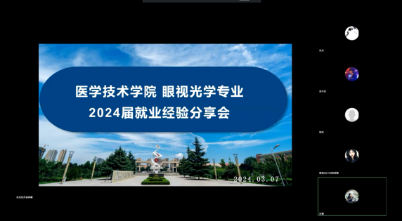 为帮助2024届眼视光学专业毕业生了解行业现状、选择就业方向、获取招聘信息、掌握求职技巧、积累求职经验,增强就业信心,我院分别于367日晚19:30开展两场线上“眼视光学专业2024届就业经验分享会”。本次分享会邀请我院2023届毕业生窦乐乐、高文静、陈浩曦、李梦晨、李鼎、张渊、张卉子、薛延、刘丹娜九位同学做了专题就业分享,他们分别从事于公立医院、私立医院、事业单位、行业企业等。会议由眼视光专业教师闫瑾、朱丹主持,学生科科长刘慧、毕业班辅导员李周、就业专干李卓遥及2024届眼视光学全体毕业生参加了此次分享会。
